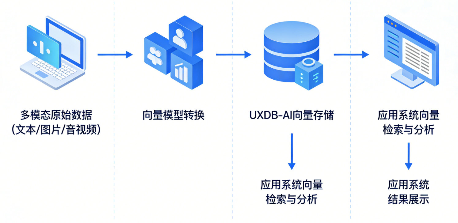 UXDB-AI数据库遵循“数据输入-向量处理-存储检索-结果输出”的全流程逻辑,高效衔接应用系统,实现智能数据分析与展示,UXDB-AI数据库应用流程示意图: