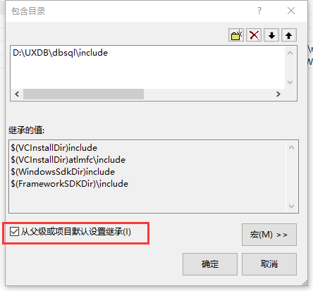 右键“项目”=>“属性”=>“配置属性”=>“VC++目录”,分别选择包含目录和库目录,进行编辑,分别添加uxdb\dbsql下的include目录和lib目录(编辑目录时勾选从父级或项目默认设置继承,目录根据实际路径编辑)。