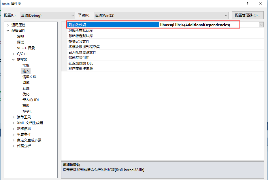 右键“项目”=>“属性”=>“配置属性”=>“链接器”=>“输入”,编辑附加依赖项,输入libuxsql.lib,单击确定。