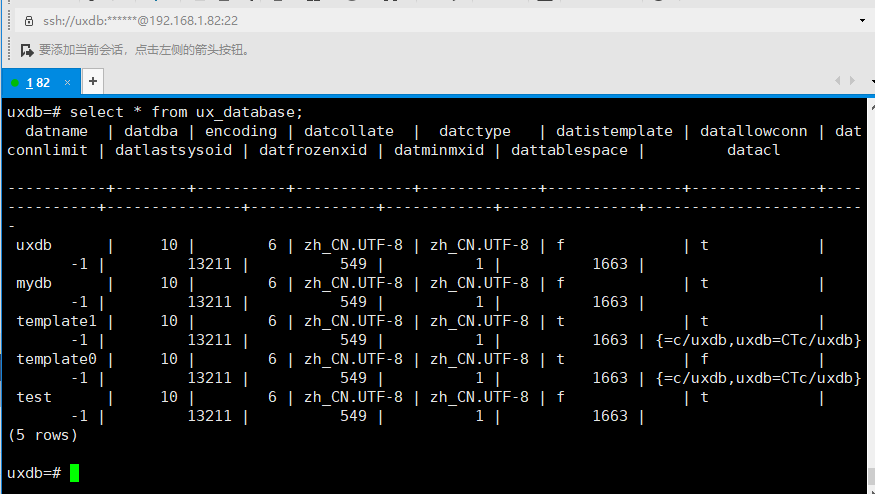 连接字符串:host=192.168.1.82 port=5432 dbname=uxdb user=uxdb password=123456。