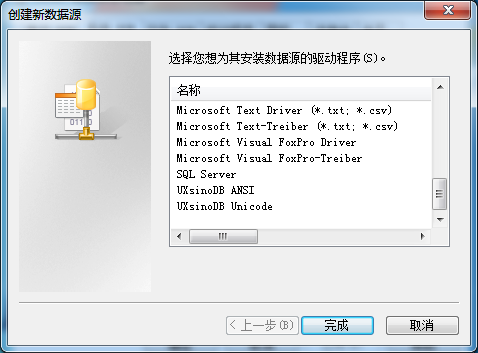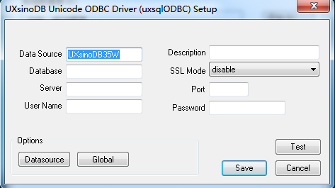 在ODBC驱动器程序列表中,选择【UXsinoDB ANSI】或【UXsinoDB Unicode】,单击【完成】按钮,系统弹出【UXsinoDB ANSI/Unicode Driver (uxsqlODBC) Setup】对话框。