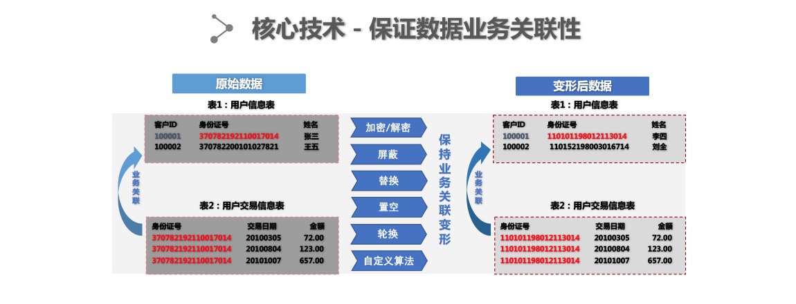 基于业务对象进行脱敏操作,不破坏数据的二义性及业务关联性。