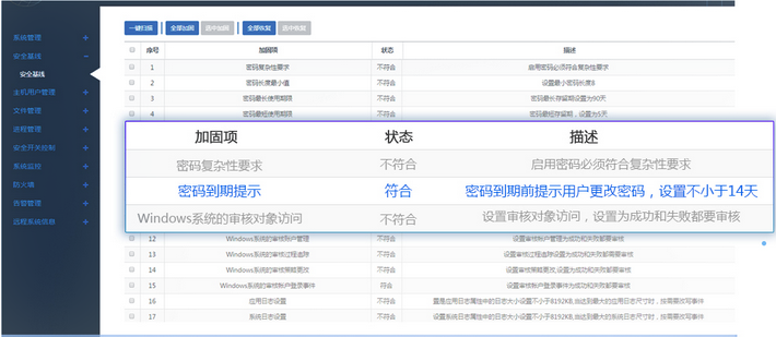 安全基线扫描,可以检测复杂程度、密码最短使用期限、强制密码历史、用户登录日志记录、应用日志记录、账户锁定时间等。如下图: