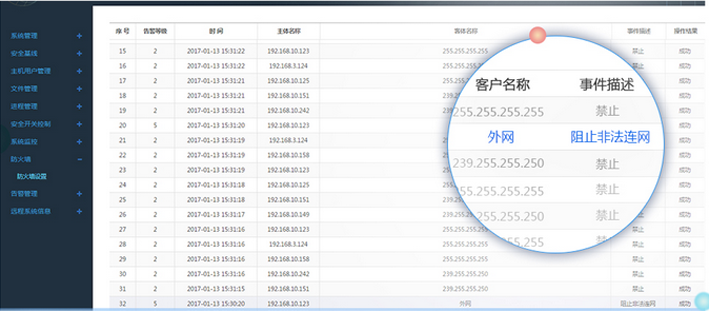 非法外联;可记录非法外联的IP地址,外联白名单,非法外联告警等级,告警日志推送等。具体如下: