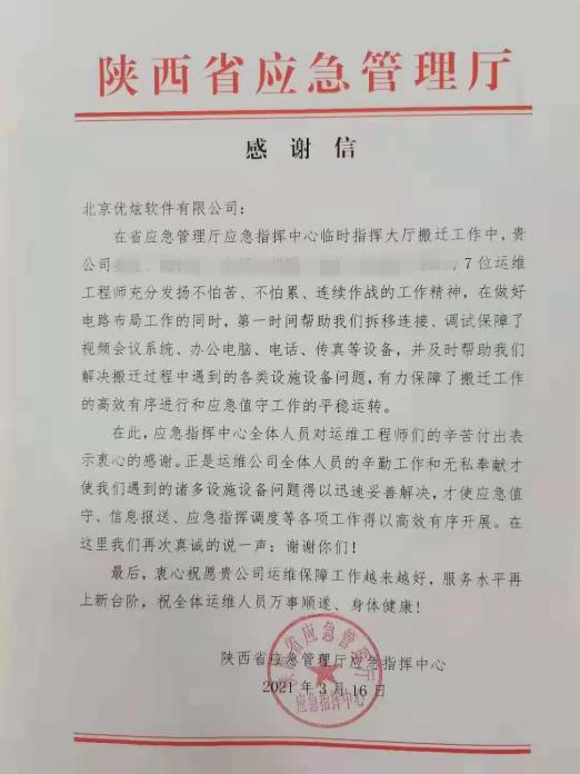 匠心服务再获认可 | 优炫软件收到陕西省应急管理厅感谢信