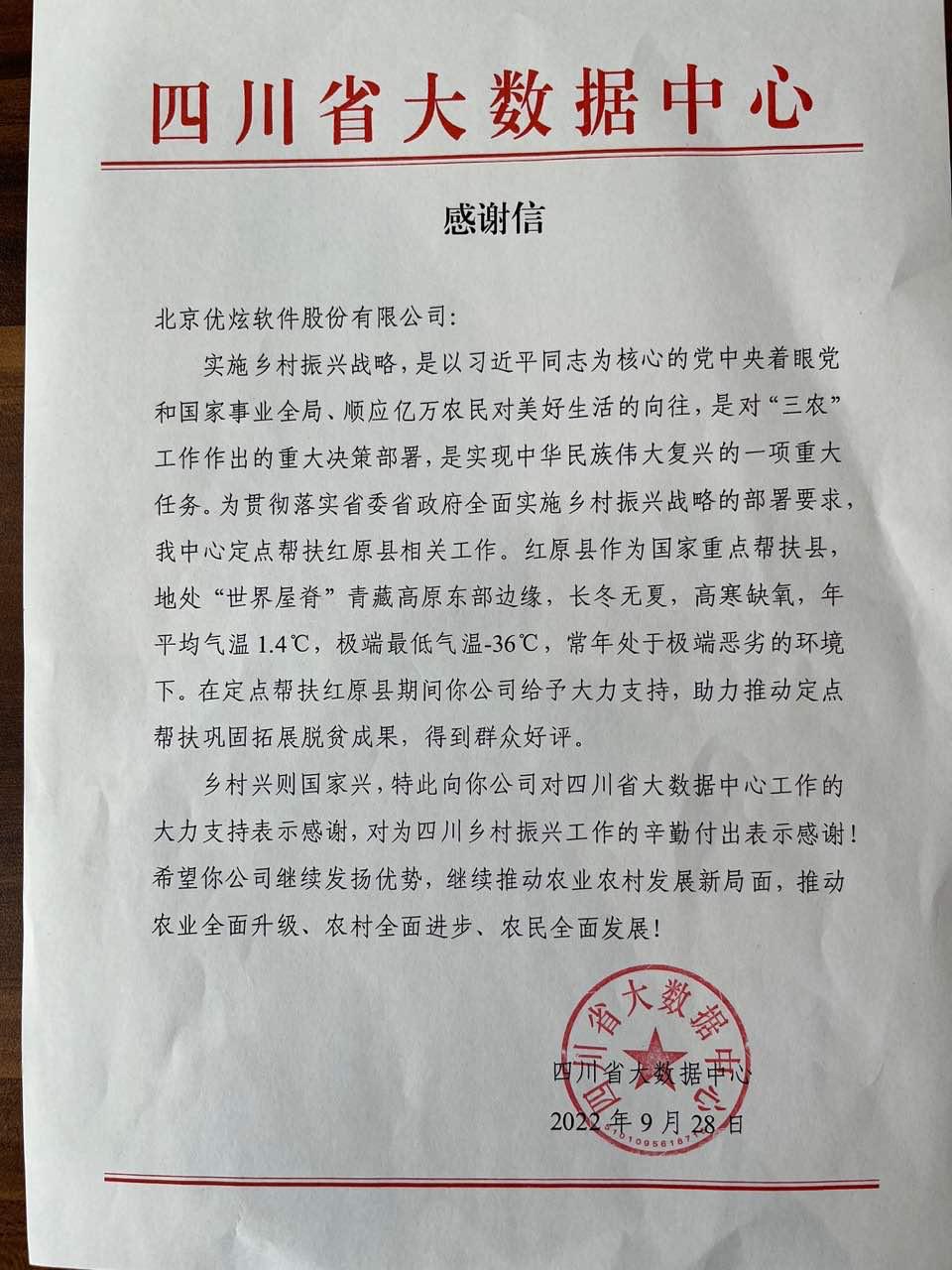 近日,优炫软件收到四川省大数据中心感谢信。信中充分肯定优炫软件在对中心定点帮扶红原县巩固拓展脱贫成果、推动乡村振兴工作的突出贡献,同时希望能够持续发扬技术优势,积极推动农业农村发展新局面,为国家推进乡村振兴战略再立新功。
