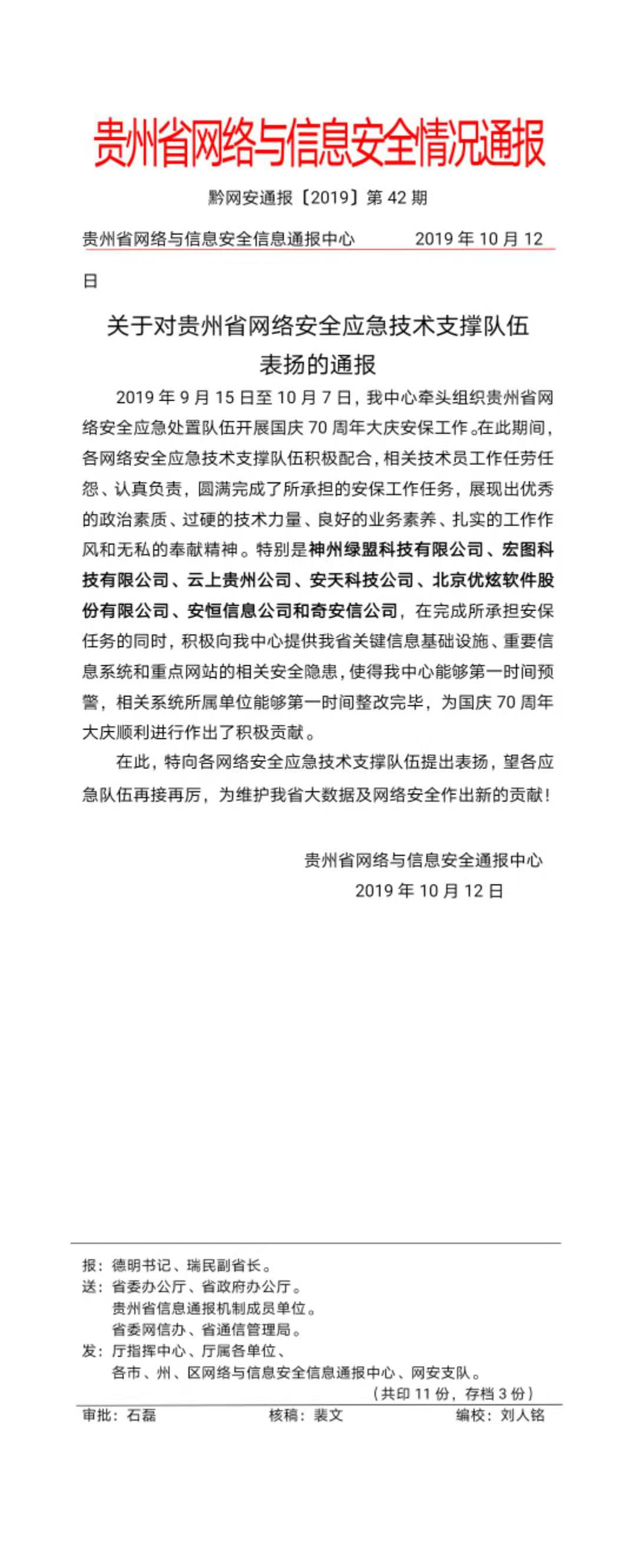 日前,优炫软件作为贵州首批网络安全应急处置支撑队伍,全程参与了国庆70周年安保工作。凭借高度的责任心、过硬的技术、扎实的工作,优炫软件得到了贵州省网络与信息安全通报中心的点名表扬。